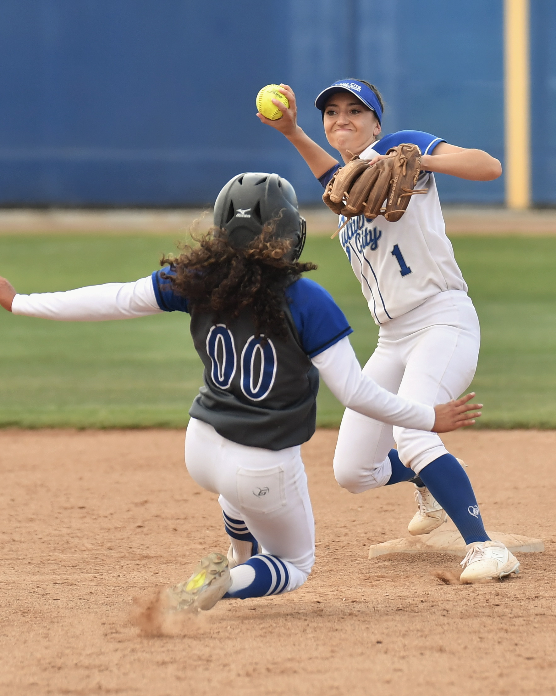 Culver City shortstop Daisy Estavil touches second base and throws to first to complete the double play during a game. The Centaurs beat visiting El Rancho 2-1 in the Division 4 wild-card game last Tuesday. The softball team advances to the first round where they will face Mary Star of San Pedro on the road Thursday (today) at 3;15 p.m. Mary Star’s overall record is 19-4; they were 12-0 in the Camino Real League.