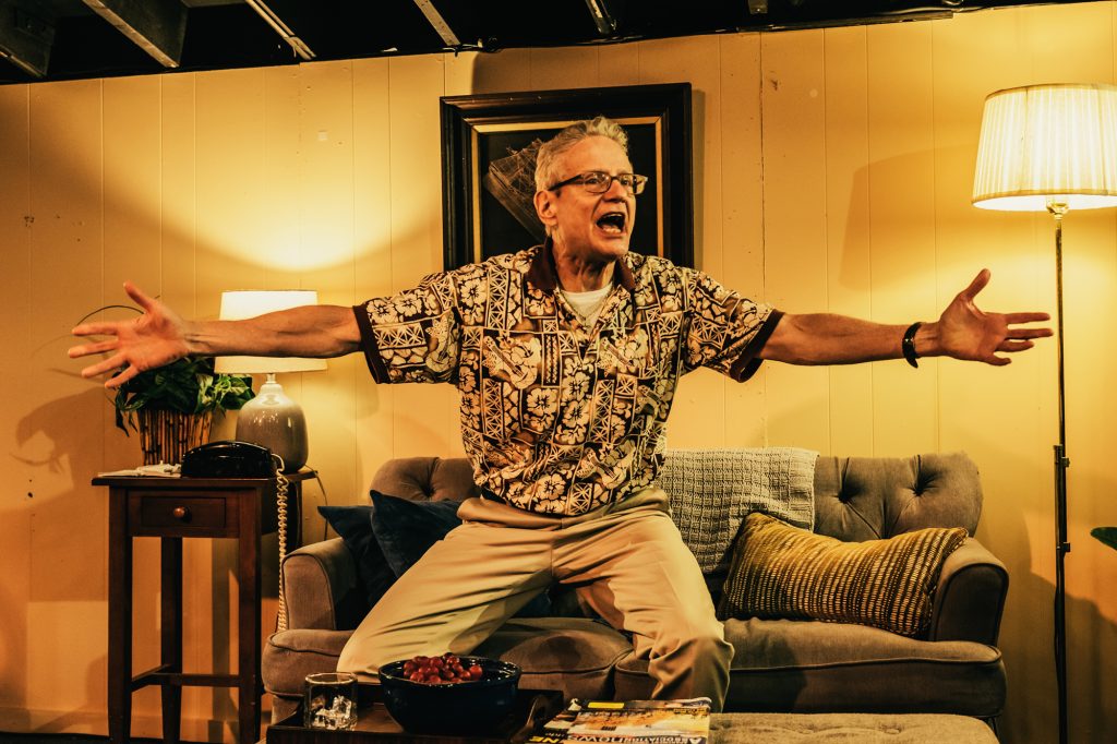 I asked Justin Tanner if he was always planning to perform both roles when he wrote the play, and he shared, “I wrote the part of Douglas (the dad) for myself. It was only after (director) Lisa James read an early draft and recommended that I play both roles that I decided to perform both father and son.” And he does both roles with authenticity, donning a realistic red wig to portray the younger son.