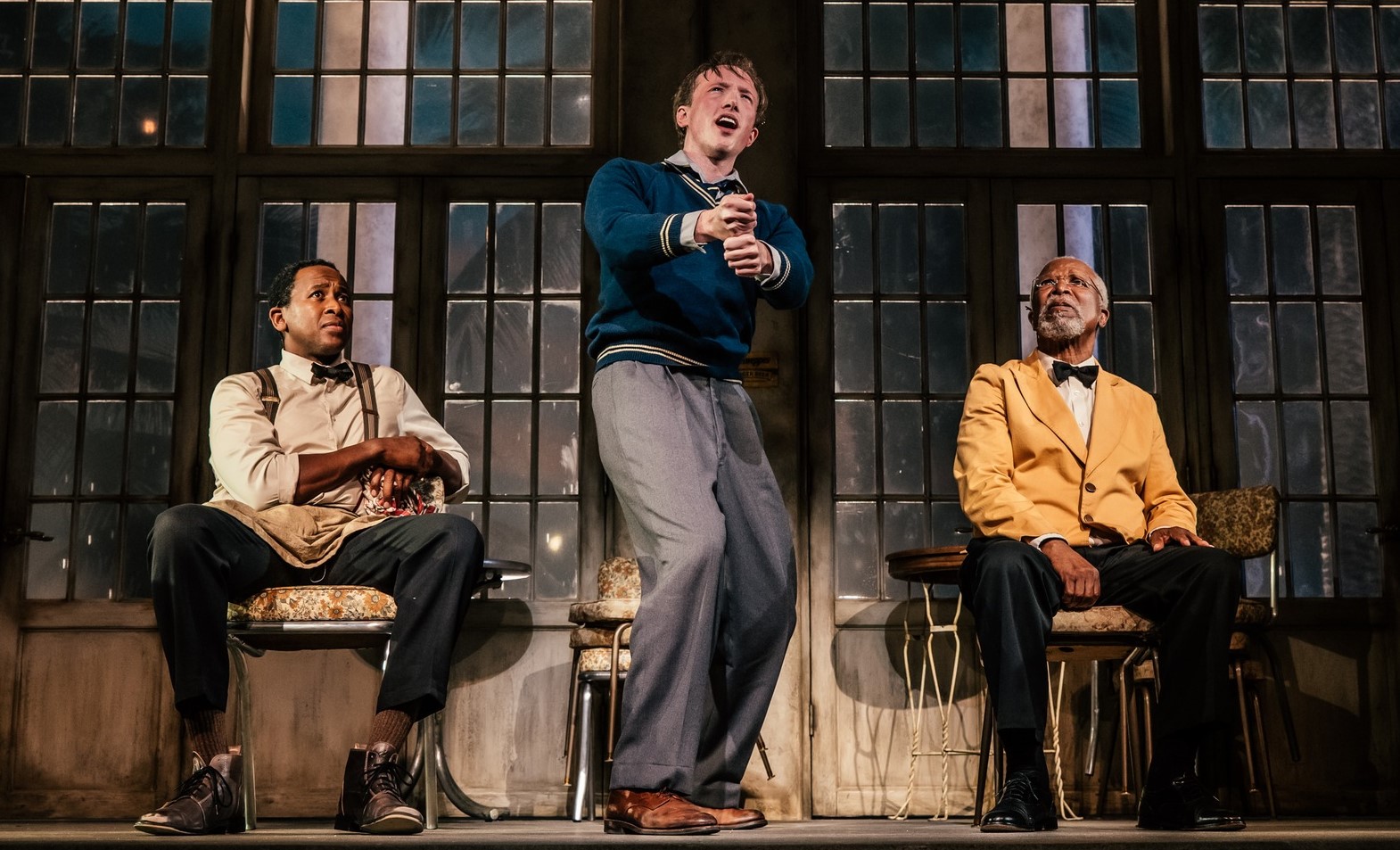 The play takes place on a rainy afternoon beginning with Willie (Nyasha Hatendi) on his knees cleaning the floor while showing his older co-worker Sam (John Kani) the steps he has learned in the pursuit of winning a local dance competition. In fact, those dancing scenes, choreographed by Koko Iwasaki Nyemchek and Kiki Nyemchek, are the most enjoyable in the show. But soon they are joined by the white shop owner’s 17-year-old son Hally (the terribly miscast 31-year-old Ben Beatty, son of Annette Bening and Warren Beatty) who at first passes the time with Sam and Willie, the two Black waiters who have helped raise him by filling the gaps of a broken home with warmth, wisdom, and laughter. But as the day unfolds, playful memories give way to painful truths, and a single moment of deep-seated prejudice, threatens to shatter the fragile bond between them forever.