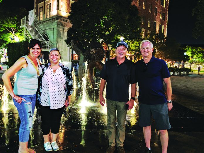 Among the Culver City sites visited, the Lethbridge guests saw the fountain in the downtown business district near the Culver Hotel. Visitors were treated to an itinerary that exposed them to the local arts scene, the city government, and the local business community. From left, are Tania Stilson, Dawn Leite, Michael Bennett, and Ted Stilson.